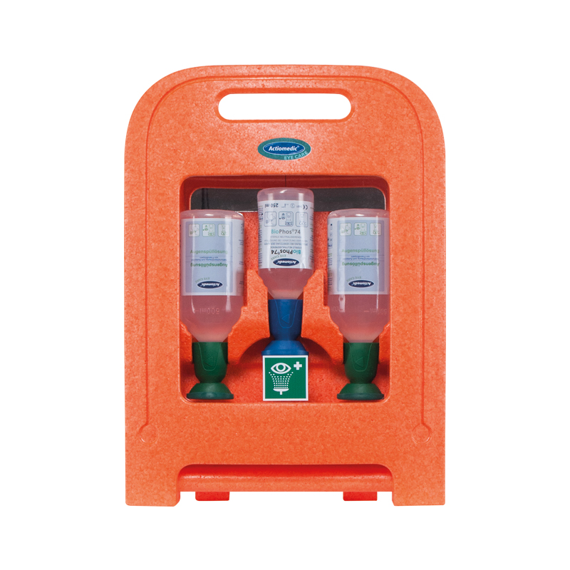 Visually appealing and easy to use eyewash station with clear lid and two bottles for wall mounting,